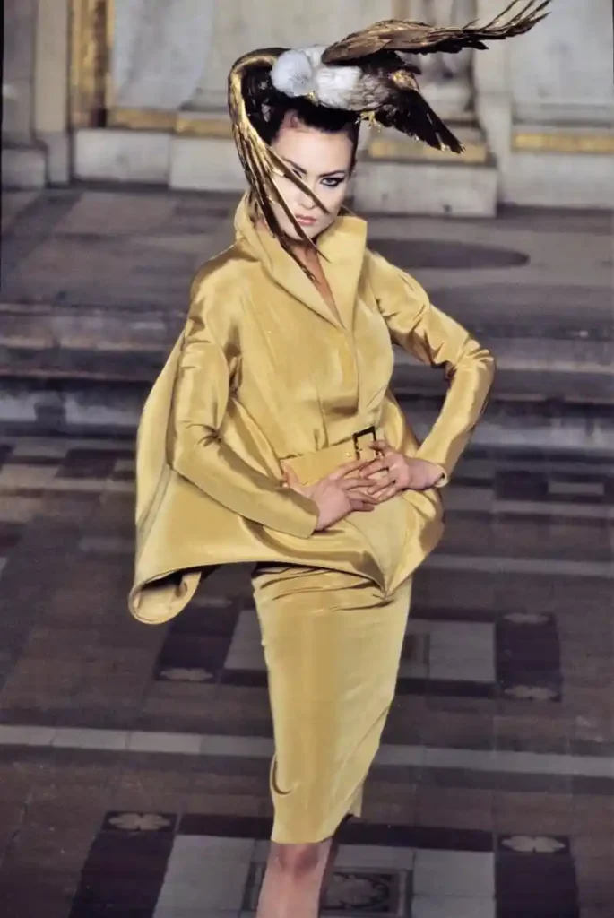 The first collection of Alexander McQueen presented for Huber de Givenchy couture house was severely criticised by the journalists. This 27-year old eccentric British fashion prodigy got his inspiration from the classical Greek myths as the brand’ logo – a square formed by four facing Gs – reminded him of the motifs in ancient Greek friezes. Press accused the young designer of making costumes rather than cloths. McQueen, hurt but unbowed, emerged from this first experience with a taste for revenge.