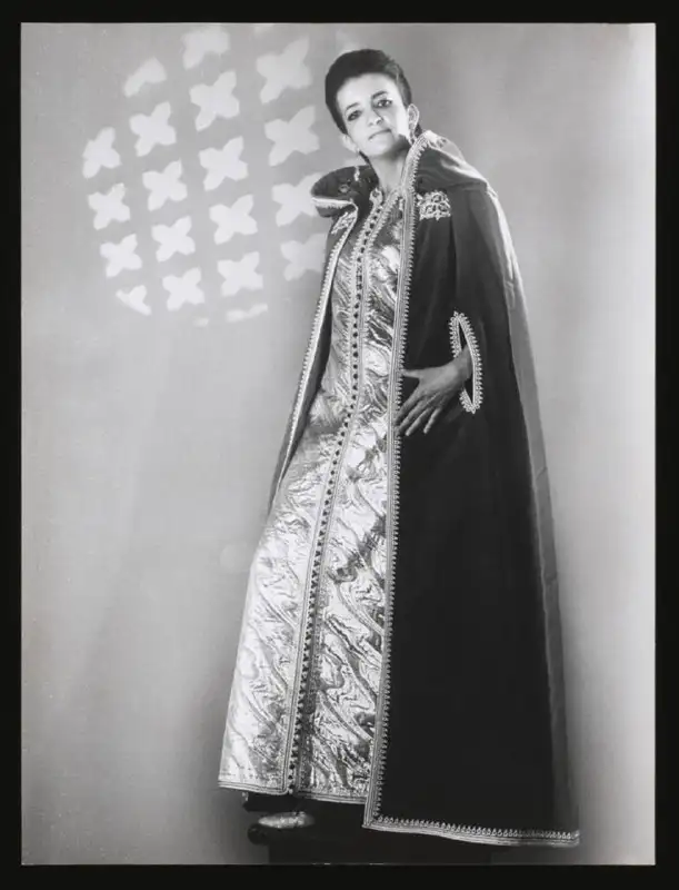 Elegant evening cloaks were one of Bennis’s signature creations. Made in a soft velvet with gold passementerie, this was the ultimate luxury design, created to appeal to the elite cosmopolitan woman of 1960s and ’70s Morocco. Bennis’s creations fused multiple design traditions. She often paired Moroccan silhouettes with French couture fabrics and used the fine woollen weave bziwi, more traditionally used for menswear, to create elegant designs for women.
