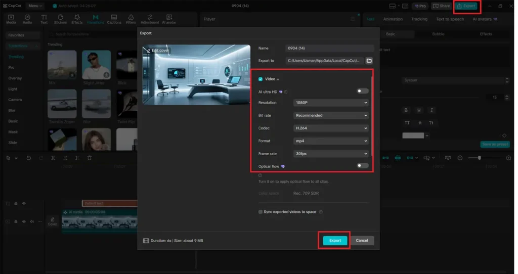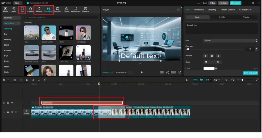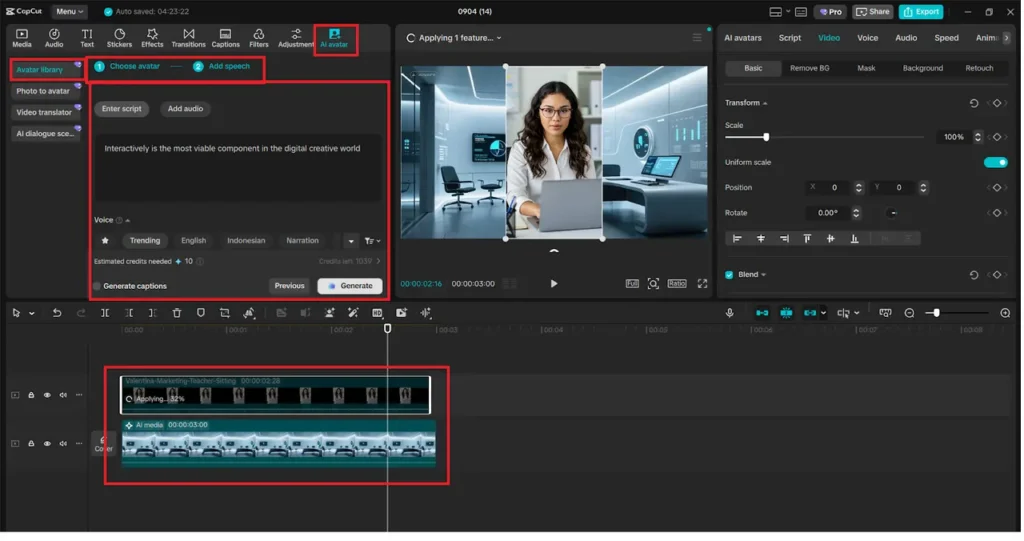 Pin your pictures and avatar videos on the timeline. Show generated images with AI during the speech of the avatar. Adding background music, text titles, and transitions into your project with the built-in CapCut library is an added step to making your content look more professional.