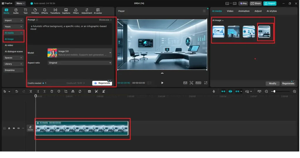 Go to the left toolbar and select AI media, and then AI image. Write your prompt with what you want to see in the background, such as a futuristic office background, a specific color, or an infographic-based visual. After the creation of images, the image of choice can be dropped once the timeline is opened.