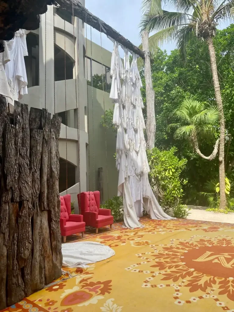 Malca, who also owns a summer home in Ibiza, considers the exhibition space to be his gift to the island, which he calls one of the most magical places on earth. La Nave opened with an exhibition of works from Lio’s private collection by Brooklyn-based artist KAWS. I found KAWS renowned Mickey Mouse, original, sitting in the hotel reception hall, one of my favourite art piece of the property.But even before the reception, hotel guests and visitors (there are also three art-restaurants on the residence’s territory) are greeted by the functional and highly photogenic art object designed by the owner himself. The “curtains” made of local wedding white dresses and swinging sofa and arm chairs, perfect Instagram spot which somehow became hotel signature.