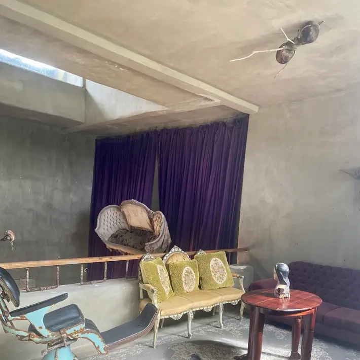 But even before the reception, hotel guests and visitors (there are also three art-restaurants on the residence’s territory) are greeted by the functional and highly photogenic art object designed by the owner himself. The “curtains” made of local wedding white dresses and swinging sofa and arm chairs, perfect Instagram spot which somehow became hotel signature.