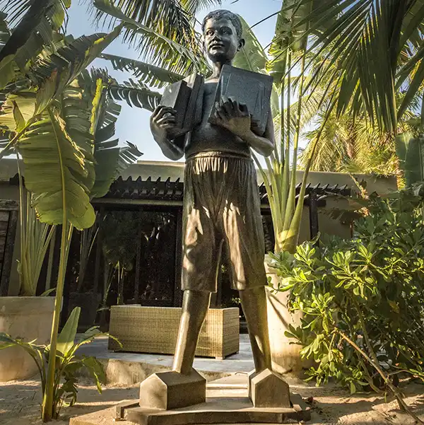 Or again a work of another Indian Artist Jitish Kallat called “Eruda”. Its a sculpture of a young boy selling books on the traffic lights of Mumbai. The children (who could sometimes be illiterate) often sell these books authoritatively, playfully engaging in conversations about the book’s interest value; their rigour, audacity and endurance making them mascots for the resilience of a city such as Mumbai. Kallat’s sculpture has feet shaped like homes, forming the quintessential image of a nomad whose home is where he lays his feet.