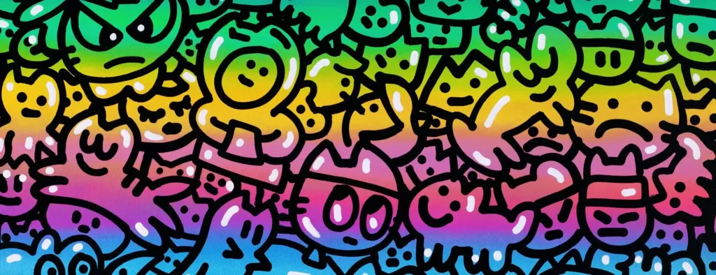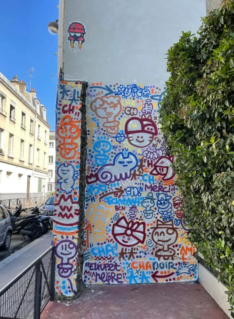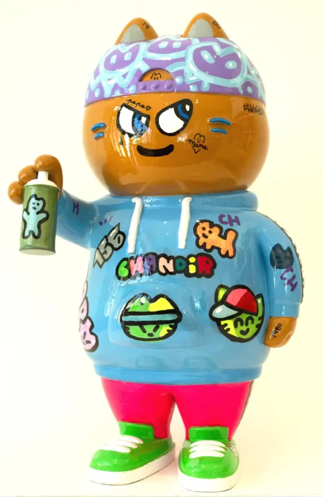 Cat lover, CHANOIR chose his artistic name in a reference to Steinlen’s poster: “le cabaret du chat noir”. His “CHA” ( “cat” from french) logotypes, drawn spontaneously, constantly change shapes. Naive and always expressive, they communicate their emotions to passers-by, according to the mood of the creative. Alberto’s father, Gustavo Vejarano, Colombian esoteric artist, transmitted to him the spiritual approach.Thus, CHANOIR conceives art as a transmission of energy from mind to mind, with the aim of entertaining and playing with the spectator.Since his beginnings, Alberto Vejarano has been constantly pushing the boundaries between graffiti, street art, logotypes and tags. Over the years he integrates into the post-graffiti universe the Kawaii and cartoon aesthetic, like current emojis. If the vitality of Latin and South American cultures animates him, it is in the streets of the 19th arrondissement of Paris that CHANOIR began his artistic journey, where he created his first CHA. And it is the street that still attracts him. For its freedom, its independence, its power of expression and for the people who populate it. It is the street that constantly disguises and transforms itself like Alberto’s CHA. Over the years, CHANOIR has extended his art towards performance, installation, photography, design and video art.Jean-Michel Basquiat is a major source of inspiration for CHANOIR, but also icons such as Snoopy, Barbapapa, Monsieur Madame, Hello Kitty, the Shadoks, the Smurfs and Gumball. He is passionate about parietal art as well (also referred to as “cave art”) as its totemic paintings evoke the mystical power of primitive arts
