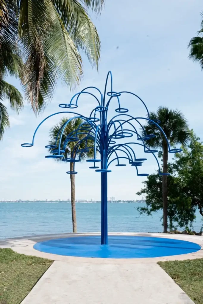 The deep blue hue of the HOOPS Tree makes a striking statement against Miami’s coastal backdrop, inviting onlookers to immerse themselves in its visual splendor. This interactive installation not only showcases Hendry’s artistic prowess but also offers an exhilarating challenge: sink 34 consecutive baskets in each hoop, captured on video from December 6th to 9th, and win a staggering prize of one million dollars!