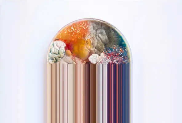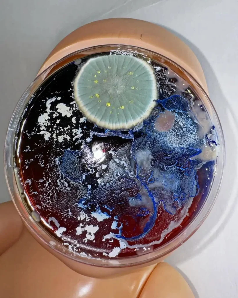 Firstly I need to feel that I miss them and want to see them again. The way it’s possible is to let them grow, give this opportunity, through cooking the nutrient, adding pigments and initial spores. So I go to the kitchen and boil nutrient agar, before hardening I can affect the initial colours and artificial geometry, using stencils, tiny sculptures, stickers and so on. As soon as it’s a collaboration, I can do my part of the work as I want it to, and the rest is not my business, if we talk about one of my fav techniques of free seeding, when spores are just accidentally caught from the air.