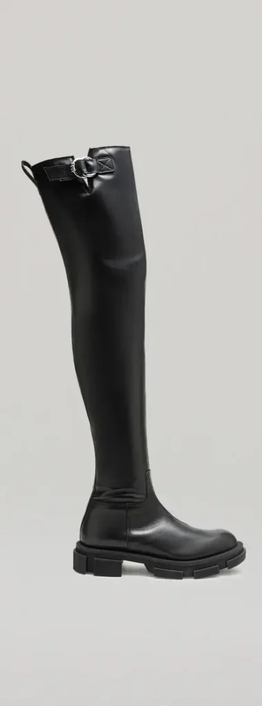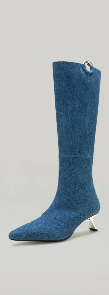 The pointy denim boot features a silver-toned lacquered resin heel, providing a lightweight and stylish option for urban wear. The kitten heel shape is chosen for its comfort, and the diagonal design adds a unique touch. True to their inclusive ethos, the denim knee boot is available in sizes up to EU 44.