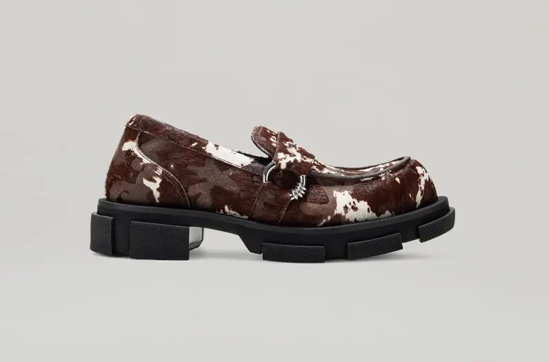 The GAO pierced loafers and velcro slip-ons incorporate punk-inspired features with materials like black and cowhide calf leather. Metal rings, reminiscent of body piercings, add edgy detail to these designs, reinterpreting classic styles with a modern twist.