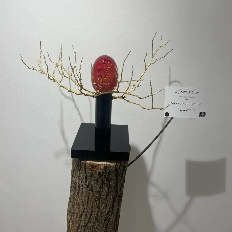 Fascinated by childhood memories of the aroma of cocoa emanating from a familiar bakery, and bright curlicues created by an experienced glassblower in the neighborhood, he creates a “living” egg. It becomes a kind of symbol. The crimson hue symbolizes the birth of existence, while the gilded shades represent the awakening of awareness and spirituality.