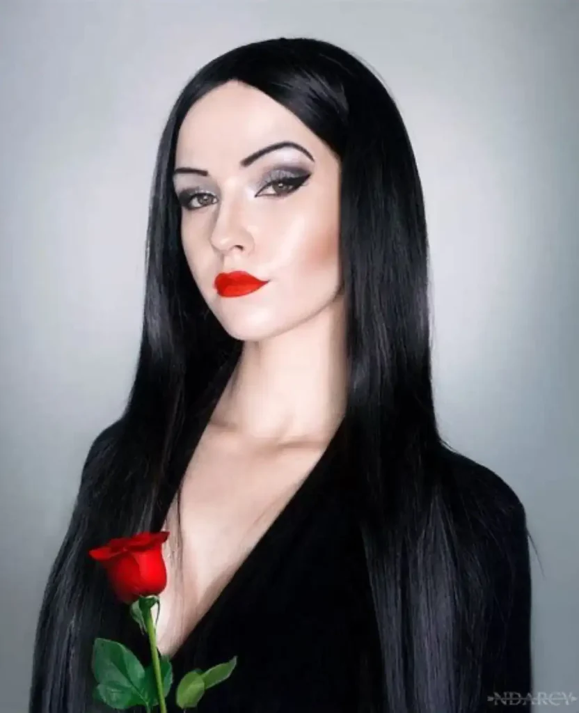 Long, dark hair with a super-slick finish can become a Morticia Adams. Give your hair the perfect shine-finish with a clear finishing spray to achieve a spooky glow. The signature Morticia Addams is popular with those who are after something decidedly refined and gothic.