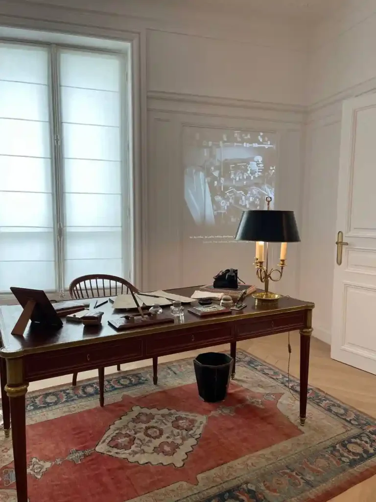 In one of the halls there is the couturier’s desk with several sketches of his dresses, and then you can see the glass floor, and under it – that famous fitting room, where models were dressed.