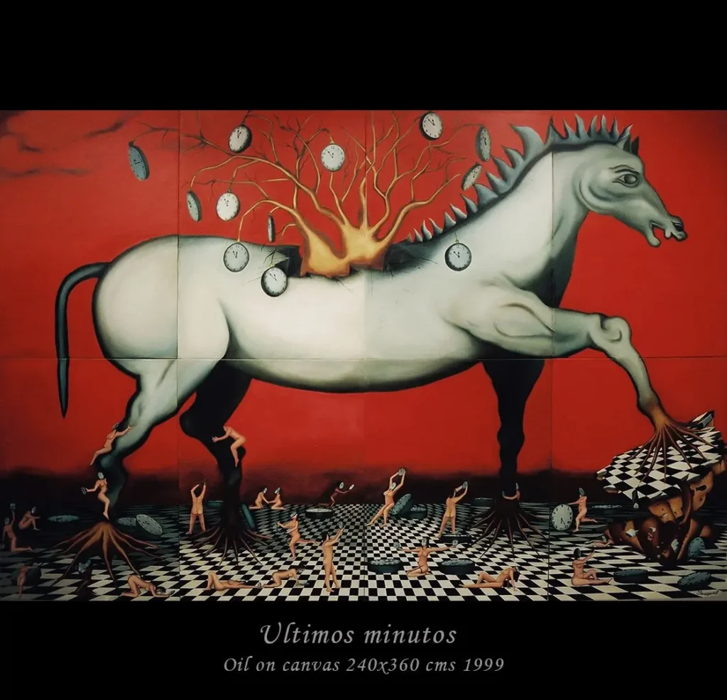 A special piece that I made is called “Últimos Minutos”, ( Last minutes) which is made of 8 paintings joined together. I created this piece in 1999 for the II Bienal de Porto Alegre in Brazil. This piece was challenging because of its dimension and its complicated composition – every panel was 120×90 centimetres. I painted one by one and I haven’t seen the finished product with all 8 panels joined together, until it was exhibited in the National Museum of Art in La Paz, Bolivia.