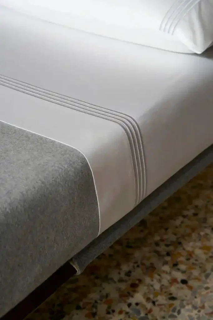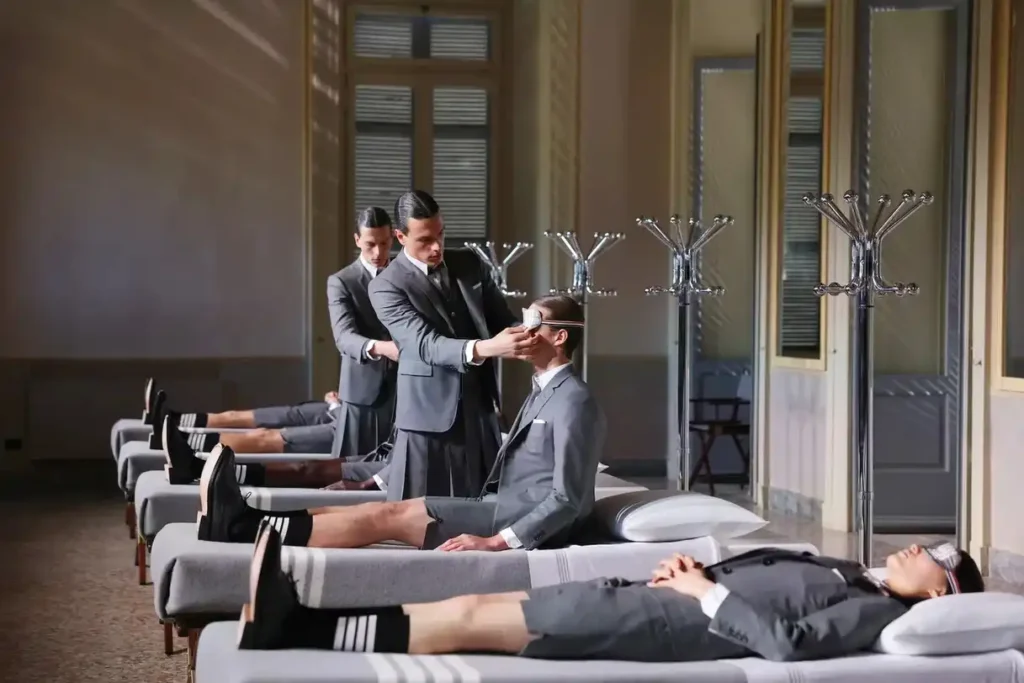 Thom Browne introduced his new homeware collection in collaboration with Frette, titled Time To Sleep. The collection, showcased in a unique performance where models dressed in Browne’s signature uniforms prepared for sleep, features an array of items including sheets, blankets, robes, and towels. Crafted from Frette’s luxurious cotton sateen and wool-cashmere blend, each piece is elegantly detailed with Browne’s iconic four-stripe insignia. This presentation was not only a debut of new products but also an artistic expression challenging conventional views on public attire and private comfort.