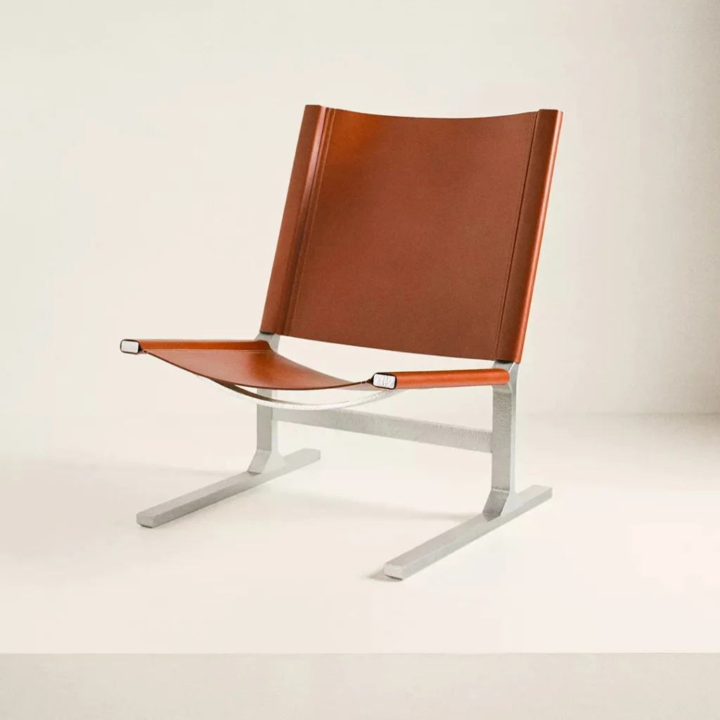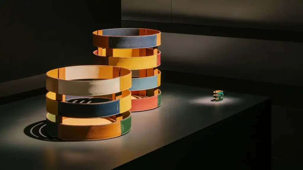 Hermès merges tradition with innovation, presenting a collection that bridges its storied past with contemporary design. The display features a mix of natural materials like wood, stone, and slate arranged to recall the iconic design of a jockey’s silk jersey, a nod to the brand’s equestrian roots. Highlighting the collection are the elegant Diapason d’Hermès armchair and exquisitely crafted lamps and dinnerware, all embodying Hermès’ signature refinement and timeless appeal.