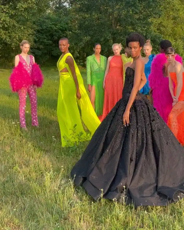 As for our physical SS22 collection, our house reinterpreted those visuals to design all but one of the Collection Couture Spring Summer 2022. As for that final dress, i used one of the visuals, as is and unchanged in a clear nod to the capabilities of artificial intelligence. What resulted was an astonishing window into a whole new genre of design, where colors open up new bridges between seasons, universes, and realities, and amplify the singularity of “savoir faire.”