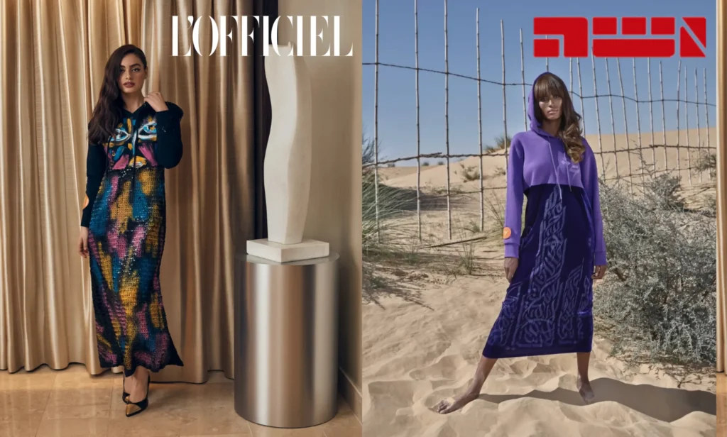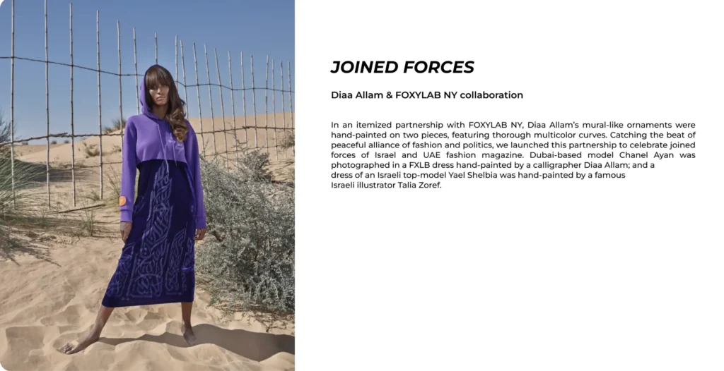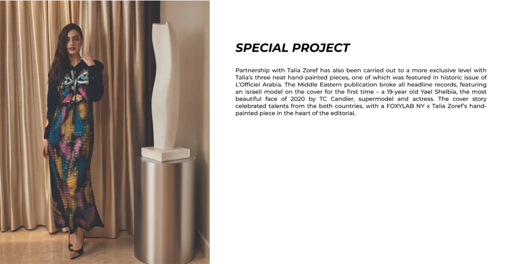 In 2021, FOXYLAB NEW YORK participated in a landmark international project. Following the historic Abrahamic Accords peace agreement, Israeli magazine LAISHA and L’Officiel Arabia from the UAE teamed up to create a collaboration celebrating the artistic talents of both countries. FOXYLAB New York In collaboration with Israeli illustrator Talia Zoref and Dubai-based calligrapher and muralist Diaa Allam created unique create dresses imprinted with artworks. Israeli top model and actress Yael Shelbia wore one of the dresses and appeared on the cover and pages of the February issue of L’Officiel Arabia. On the cover of LAISHA ISRAEL was Dubai-based model Chanel Ayan, also wearing a jointly designed dress. Therefore emphasizing a peaceful rapport between the two countries and introducing new business opportunities.
