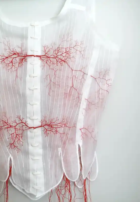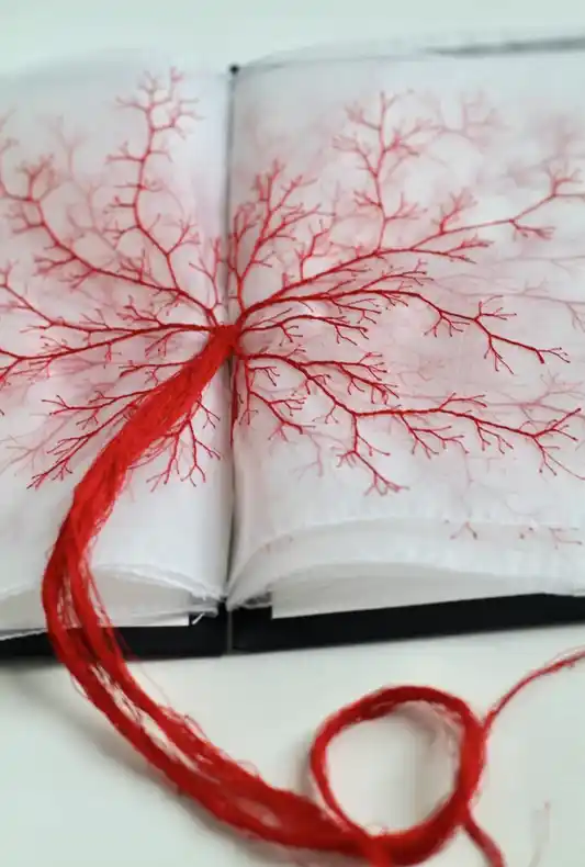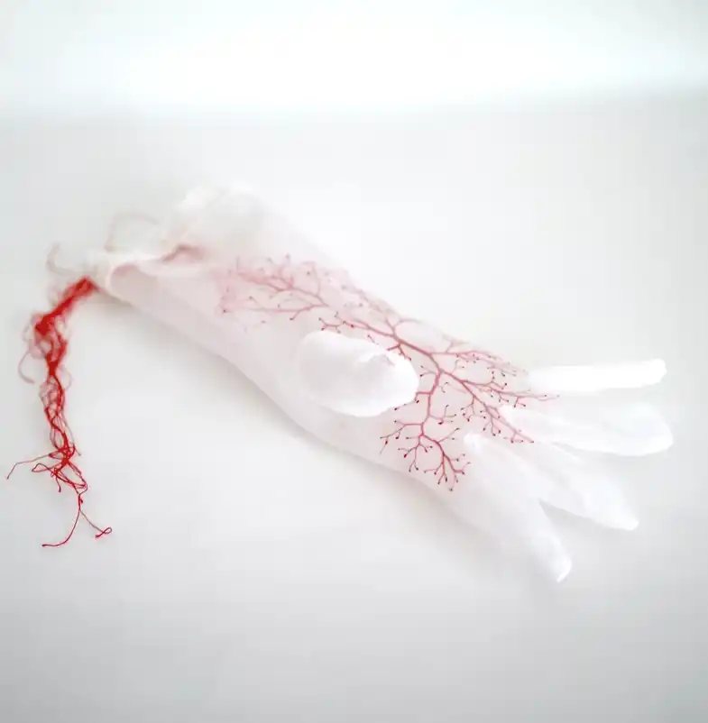 I am fascinated with the similarities between them. They both are supported by the similar structure that absorbs and distributes nourishment. Tree branches, roots, or blood vessels split into thinner appendages from thicker parts. I find those shapes beautiful. Therefore I make the thread matrix that looks like them. By doing so, I feel like I can draw energy from nature and it also reminds me of our vitality and fragility. It is my attempt to connect with nature.