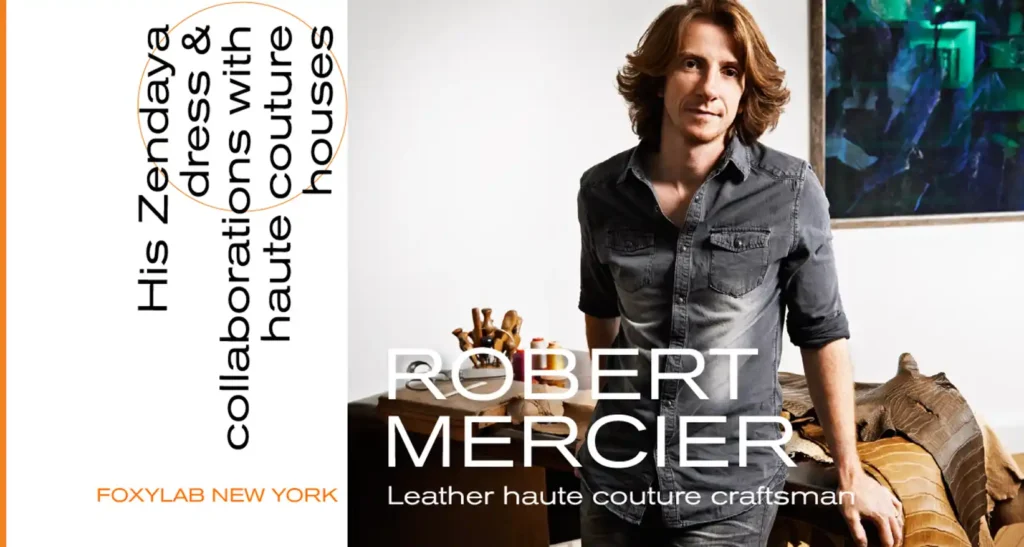 With Robert Mercier we met a bit more than a year ago at the occasion of his first personal exhibition in Paris within the fashion week. Robert is an artisan of arts specialised in leather. In the Joyce Gallery he was presenting his independent collection “The Hitchbag” inspired by the artist’s favourite film director Alfred Hitchcock and his characters. It was love at first sight. The world of fashion started to talk about this gifted artist at the moment when Zendaya wore his iconic nude high-slit gown with a draped leather bodice at the Venice film festival while promoting the first part of ‘Dune’ movie. Signed by Balmain, this dress was in reality conceived and made by our protagonist.
