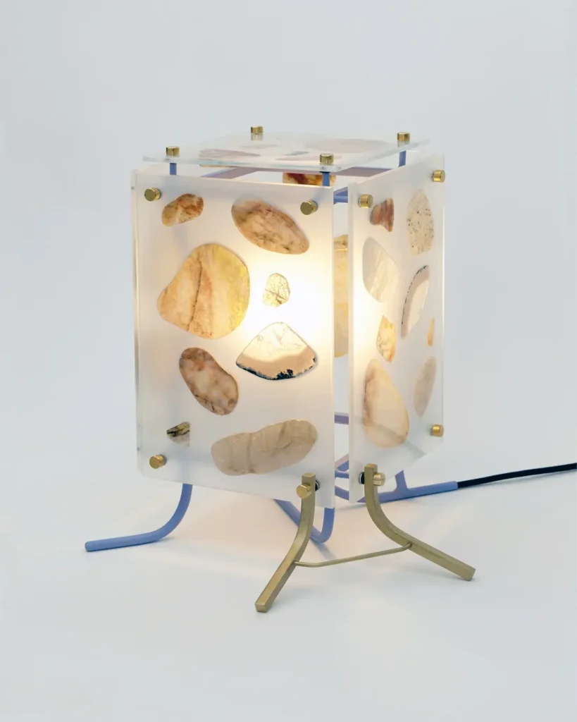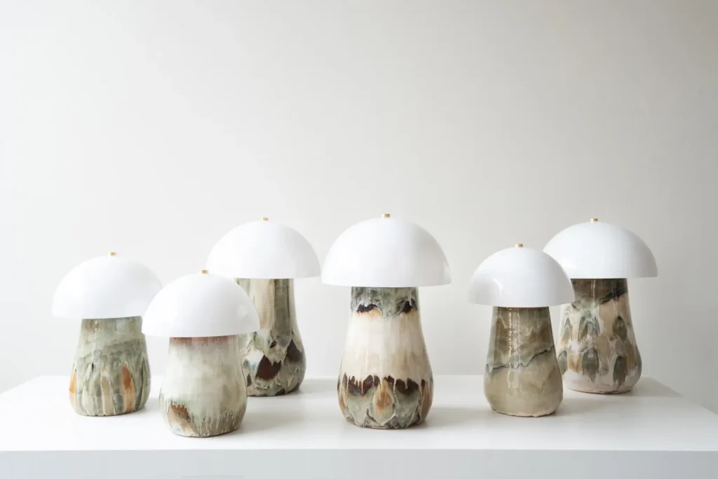 The Future Perfect gallery fixtures, design duo Chen Chen & Kai Willaims will premiere the Moon Pearl Table Light series which borrows from the stratigraphic technique the duo developed for their highly popular Geology Mirrors, wherein stone offcuts are seamlessly embedded into glass; the six lamps, with the lightbulbs housed in ethereal rectangular glass boxes, present a range of material experiments within their contained, deliberately engineered form—from clear glass with graphic black hardware to a variety of sandblasting methods combined with brass covered in a rich turquoise patina. Also debuting a new series is another stalwart of The Future Perfect program, Ben & Aja Blanc, who will present the Penny Bun lamps—a cluster of six lamps that take their form from their sumptuous namesakes (a.k.a Porcini mushrooms), their shades made from milk-white glass, with ceramic stems, the striations between the earth-toned glazes creating a marble-like effect.