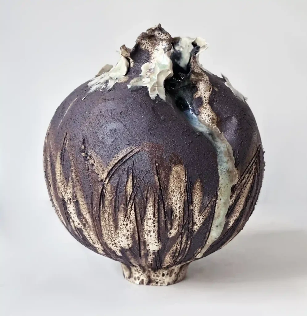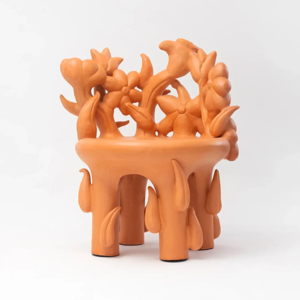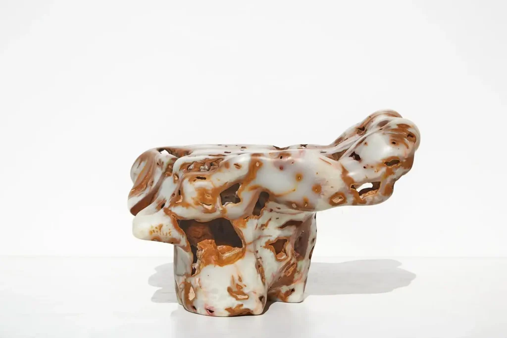 Brooklyn-based, Korean-born ceramicist Jane Yang-D’Haene — following a series of successful solo exhibitions over the past year, including Remembrance at The Future Perfect’s Goldwyn House — has created a new series of works rooted in the tradition of the Korean moon jar, of which nine pieces will be featured in this showcase. Marked with a deep sense of rawness, the works serve as reflections on the artist’s relationship with her body after a recent cycle of going through illness, treatment and recovery, and how this has shaped the process of making—the vessels are marked with scars which are then mended with more layers of porcelain and glazed, tracing their journey of becoming with poignant beauty. Another gallery mainstay, ceramic artist Reinaldo Sanguino, has created a variety of meditation stools and benches, boxes, vessels and bowls in his signature intuitive, collagistic style, rich with texture and color—reds, yellows, pastels and rich jewel tones blur together, producing visual effects such as the colorful halo of a neon light, or patches of snakeskin.