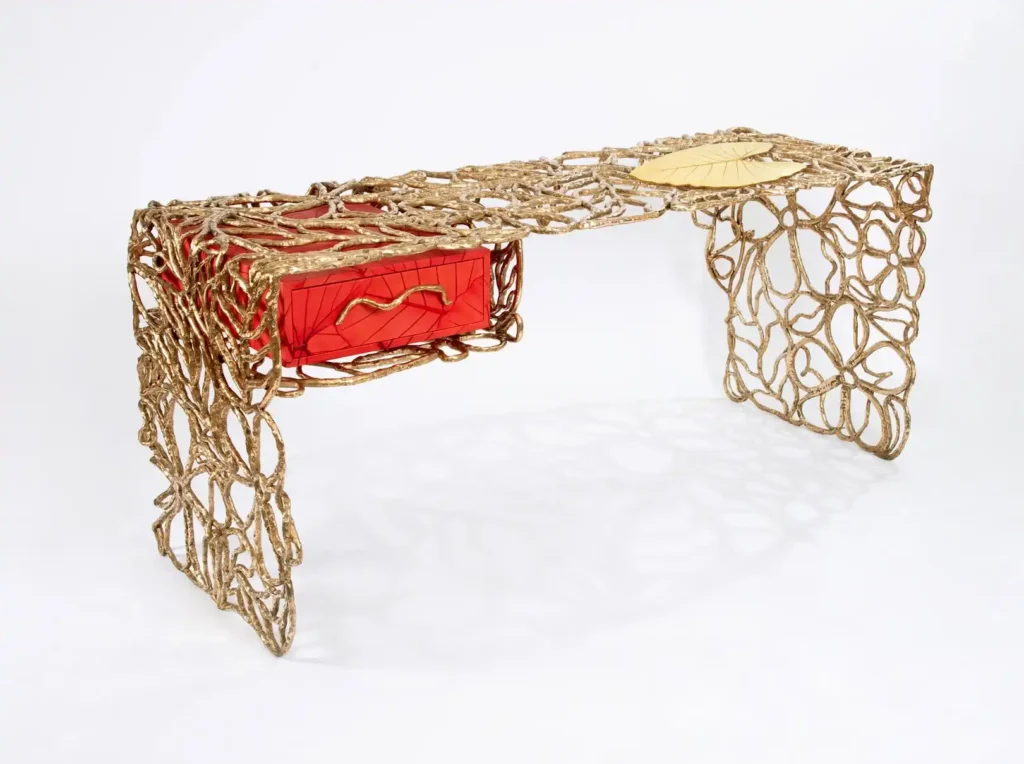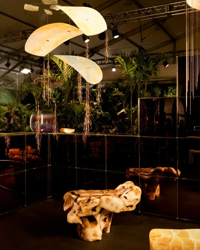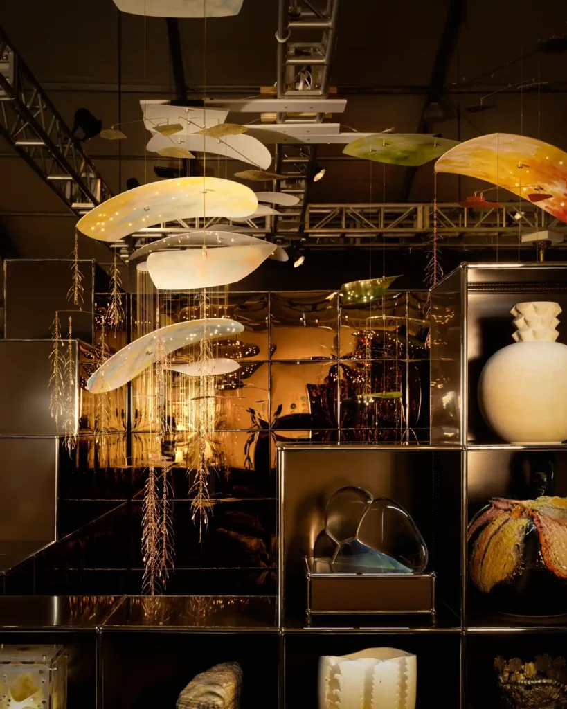 Within the display case, making her debut at Design Miami/, Miami-based artist Autumn Casey will present four light sculptures inspired by classic Tiffany lamp designs, extending the phantasmagoric potential of the genre towards a moving, earnest humorousness—John and Jackie is a pair of fluorescent flamingoes, whose bodies light up from within; The Garden of Eden is a tortoise, flowers growing from its shell; Woodstock is a globe composed from psychedelically-colored tree leaves, standing upon a glossy black pedestal. Meanwhile, Bradley Bowers will present six sculptural paper lanterns, riffs on his acclaimed Halo series, smaller than the work Bowers typically creates; the artist sculpts each by hand in a dance with the material, which results in expressive examinations of balance and duration, the aging of these works inherent to their ever-evolving nature.