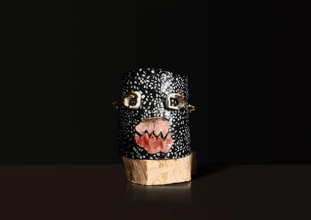 Californian ceramicist Eric Roinestad will present five new pieces— two new bust sculptures from his Hooligans series and a vessel with adorned with an owl figurine will serve as additions to the artist’s established bodies of work, while a sleek vase in an antique Greek style with a cameo portrait showcases a new development in the artists iconographic sculptural language. Fellow Los Angeles-based ceramic artist Leena Similu will show six new versions of her signature clay vessels and head sculptures, inspired by the stories and secrets handed down to her by her Cameroonian ancestry. These new iterations of the artist’s explorations of motherhood and lineage, see a bold approach to integrating West African craft traditions in its variance of mediums and materials, with wood and horse-hair and joining her clay figurines, some of which themselves present complicated in construction with the addition of large dangling earrings.