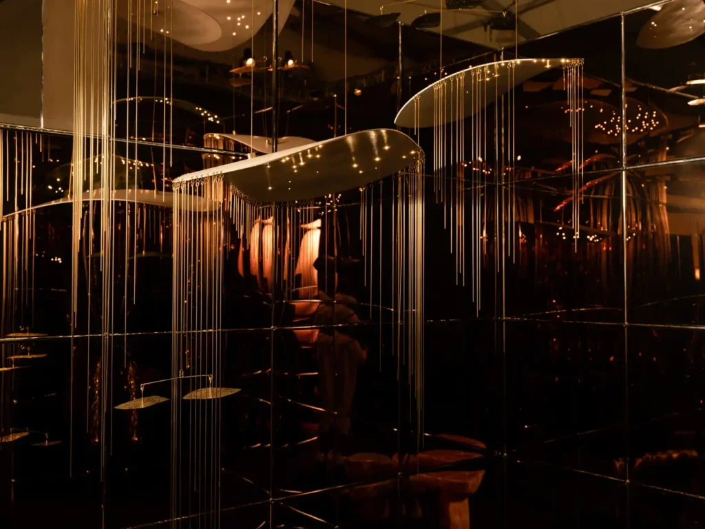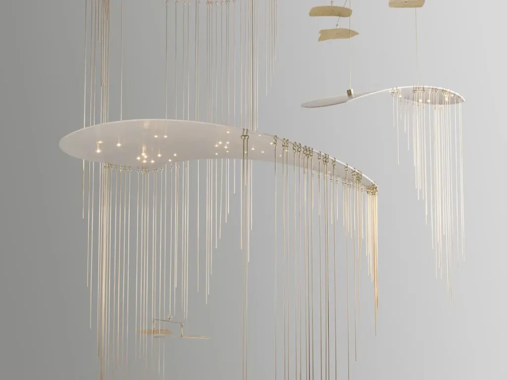 At the center of the presentation, within the enclosure, viewers will find a floor-to-ceiling mobile-like light installation by Karl Zahn, its four component pieces representing the four seasons, the lights reflecting in an ethereal dance against the bronze mirrors with which the interior space is lined. The installation is Zahn’s most ambitiously scaled work to date, featuring interventions of color—a new development for the artist. Looking out onto the installation is a bench made by ceramicist Cody Hoyt, executed in his signature style, with a striking graphic pattern composed from tiles the artist produces using the nerikomi technique.