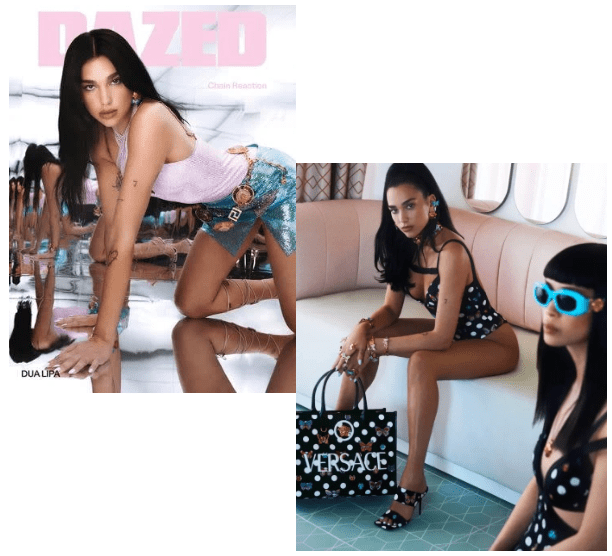Dua Lipa perfectly aligns with the iconic fashion designer’s vision, as revealed in her cover story for DAZED’s Summer Issue. In the captivating photo shoot, Lipa models key pieces from the highly-anticipated collaboration, including a mesmerizing blue chainmail miniskirt, a bedazzled pink halter top, and a gold greco-Medusa logo chain belt. In her own words, she expresses her delight in the collaboration, stating that it exceeded her expectations and was a rare instance where the outcome matched her exact vision.