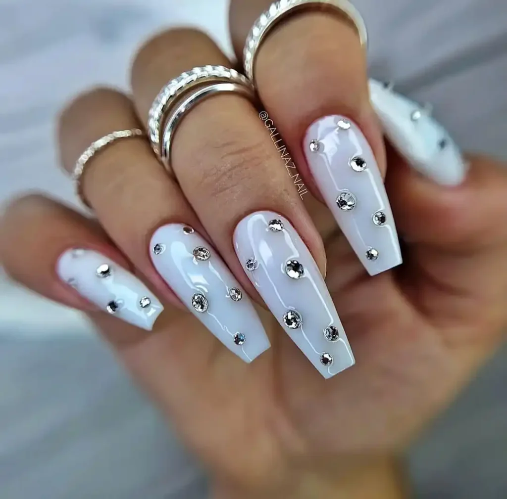 Since white is a formal color, accessorizing with glitter or rhinestones on your nails will make it glam. And if you still want something more – consider a glitter gradient or jewels within accents.