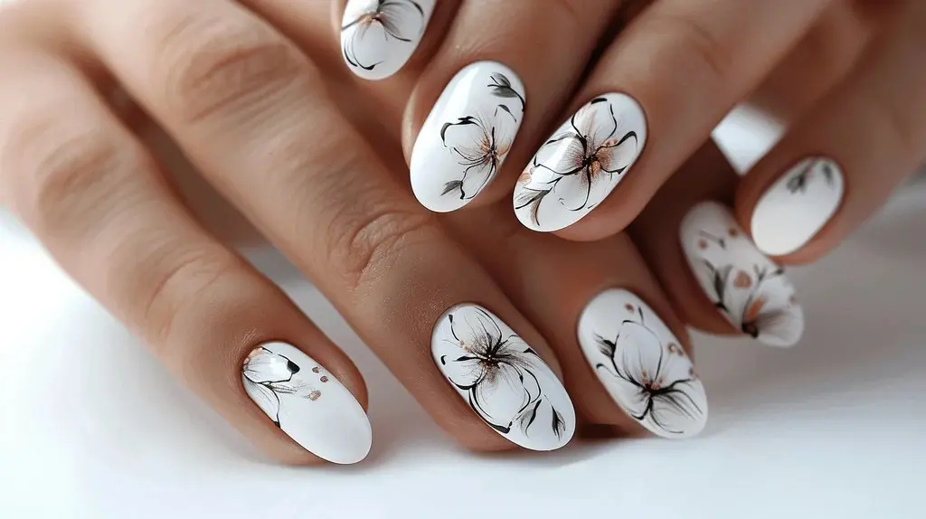 The best to go along with white nails is tropical graphics like palm trees and flowers for a summer look.